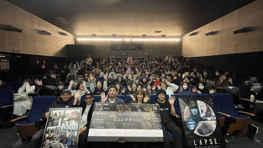 全国ミニシアターキャラバンのフィナーレ初日を迎えた本日。満員となった観客の皆様の前で、この企画を振り返ると共に、ここまで育ててくれたミニシアターという存在について、『LAPSE/ラプス』という作品が、BABEL LABELにとって、「この作品から自分たちが、自分たちの責任で映画を撮るんだ」という強い想いのこもった作品であることを話しました。また、ゲストでご登壇いただいた、中村ゆりかさん、深水元基さんからは「ホームに戻った感覚になる」「戻ってくる場所」という温かい言葉をいただき、絆の深さを改めて感じる時間になりました。