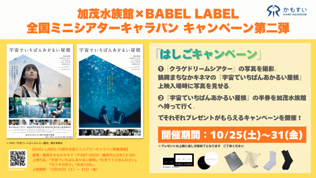 鶴岡まちなかキネマにて、同じ鶴岡市にある「加茂水族館」でロケを行った映画「宇宙でいちばんあかるい屋根」が上映されることを記念して、加茂水族館×BABEL LABERコラボキャンペーンを開催することが決定いたしました。