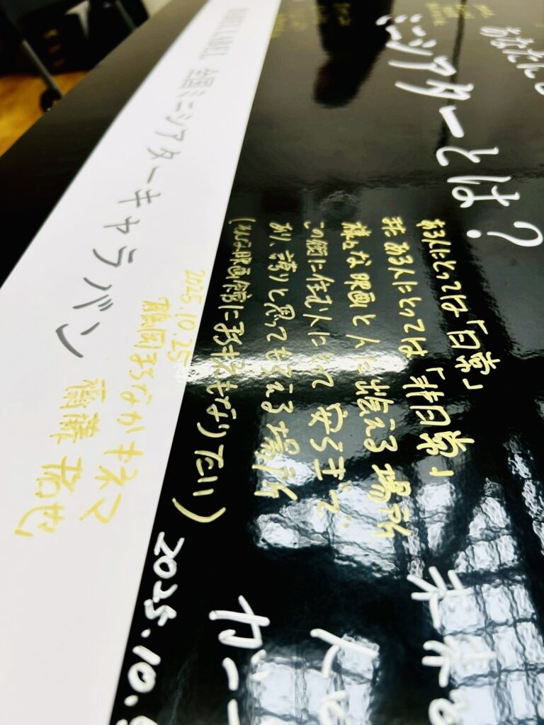 最後に、このキャラバンを通して実施されている「旅するパネル」との記念撮影へ。このパネルには、「あなたにとって、ミニシアターとは?」という質問に対して、これまでキャラバンを巡ってきた各地のミニシアター支配人の方々から、寄せ書きのように答えていただいているもので、今回は、閉館前からこの劇場に携わり、再開に向けても尽力してきた、支配人の齋藤拓也さんから「ある人にとっては“日常”またある人にとっては“非日常”様々な映画と人に出会える場所、この街に住む人にとって安らぎであり、誇りと思ってもらえる場所(そんな映画館にまちキネもなりたい)」と、一度、閉館に追い込まれながらも再開させた意義と熱い想いについて、とても重みのある言葉をいただきました。そのまま記念撮影が終わり、本日、ひとつ目の舞台挨拶は盛況の中幕を閉じました。