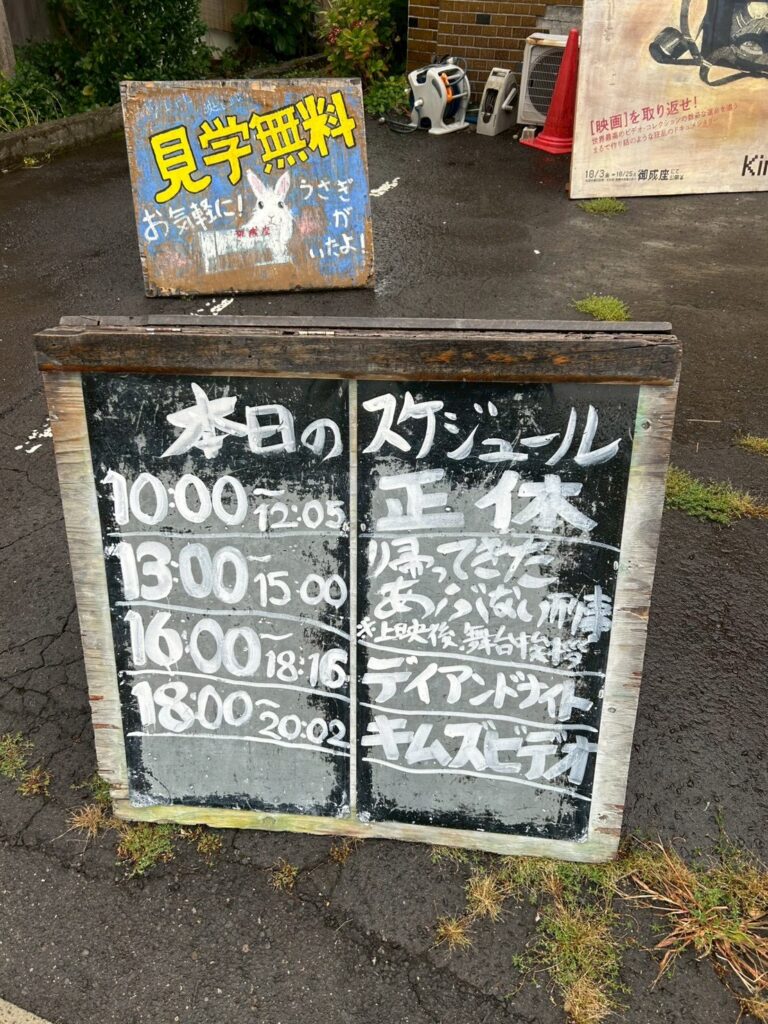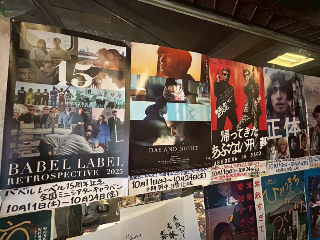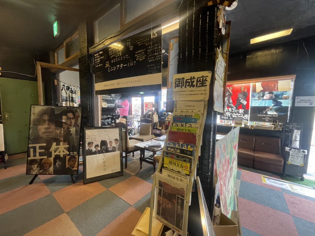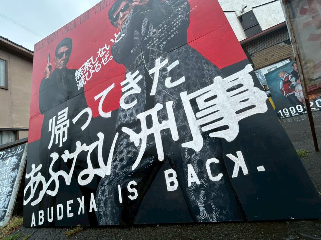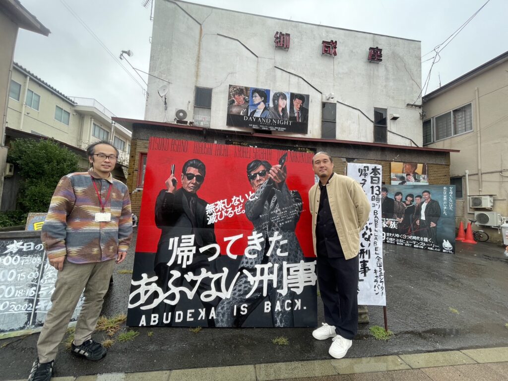 BABEL LABELとも繋がりが深く、特に、今回のキャラバンでも上映される、藤井道人監督作品『デイアンドナイト』は、隣接する鹿角市や、秋田県でロケを行った作品ということに留まらず、「御成座」の絵看板を手掛ける仲谷政信氏が美術ボランティアとして映画に参加していたり、それ以降、絆は今も続き、今回のミニシアターキャラバンが「御成座」で開催される理由の一つにもなっています。そんな「御成座」で、10月11日(土)より“BABEL LABEL全国ミニシアターキャラバン”がスタート。劇場の正面には上映する3作品のポスターや、『デイアンドナイト』『ヤクザと家族 The Family』の手書き絵看板。そして、今回のために描かれて、完成したばかりの『帰ってきた あぶない刑事』の絵看板が輝きを放っていました。館内にも今回上映される3作品の他に、今回、イベントに登壇する原廣利監督の『朽ちないサクラ』のポスター、藤井道人監督の『宇宙でいちばんあかるい屋根』、『青春18×2 君へと続く道』の絵看板が掲出され、御成座がBABEL LABERL一色に染まっていました。